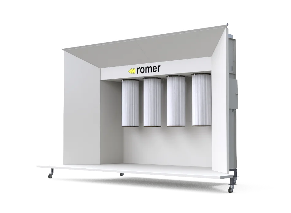 Kabina KPO to zaawansowane rozwiązanie do lakierowania proszkowego, wyposażone w system ROMER JET™, czujniki zużycia filtrów, cichą wentylację i opcjonalny odzysk farby. Łączy bezpieczeństwo, efektywność energetyczną i komfort pracy, nawet w intensywnym cyklu produkcyjnym.