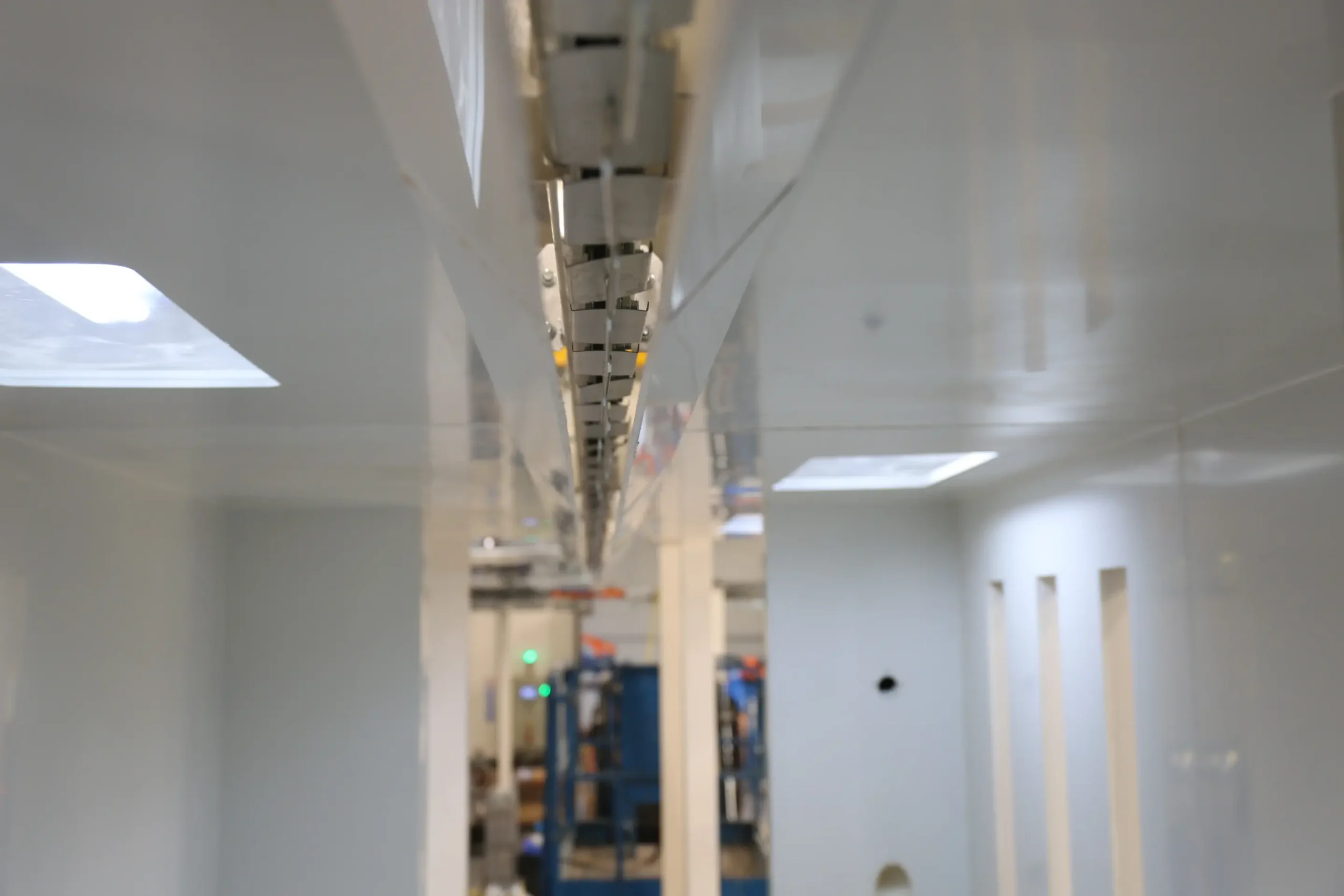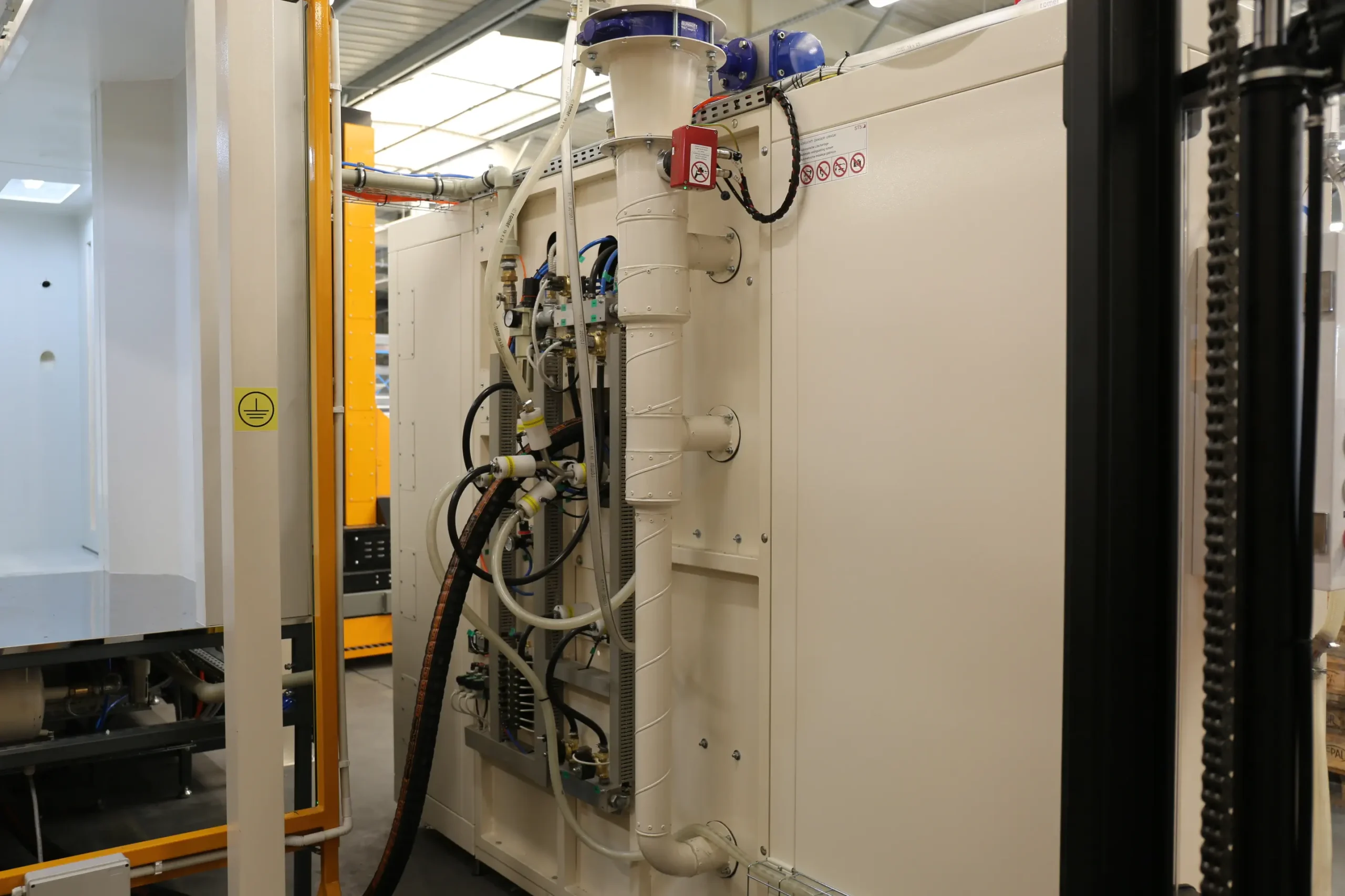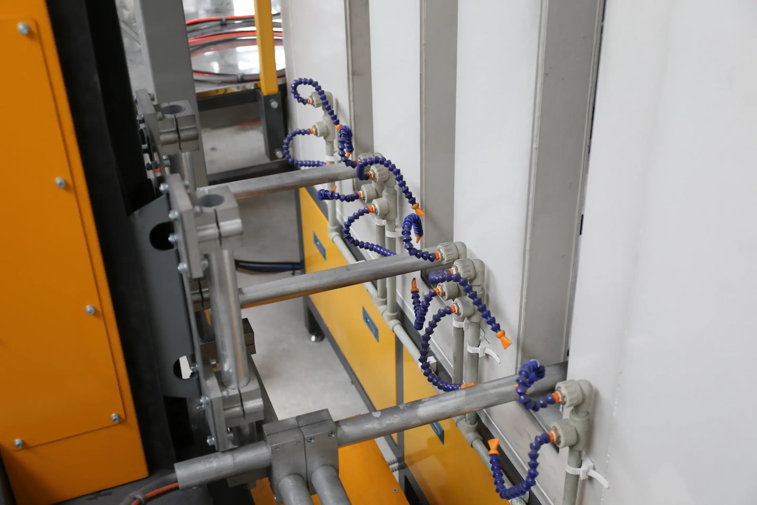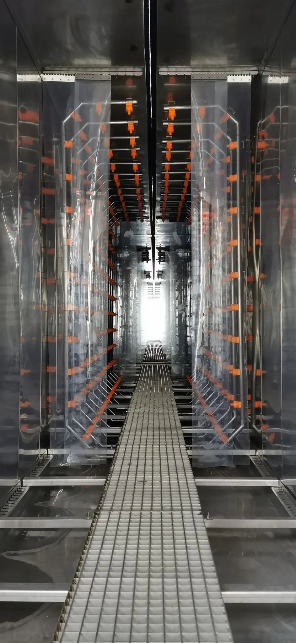 Po myciu detal trafia do strefy suszenia, w której zastosowano modułową suszarkę o wysokiej sprawności cieplnej. Obieg powietrza realizowany jest przez siedem wentylatorów, a strefy grzejne kontrolowane są indywidualnie. Kurtyny powietrzne na wejściu i wyjściu ograniczają straty ciepła, a cała konstrukcja bazuje na termoizolowanych panelach ROMER z możliwością łatwego serwisu.