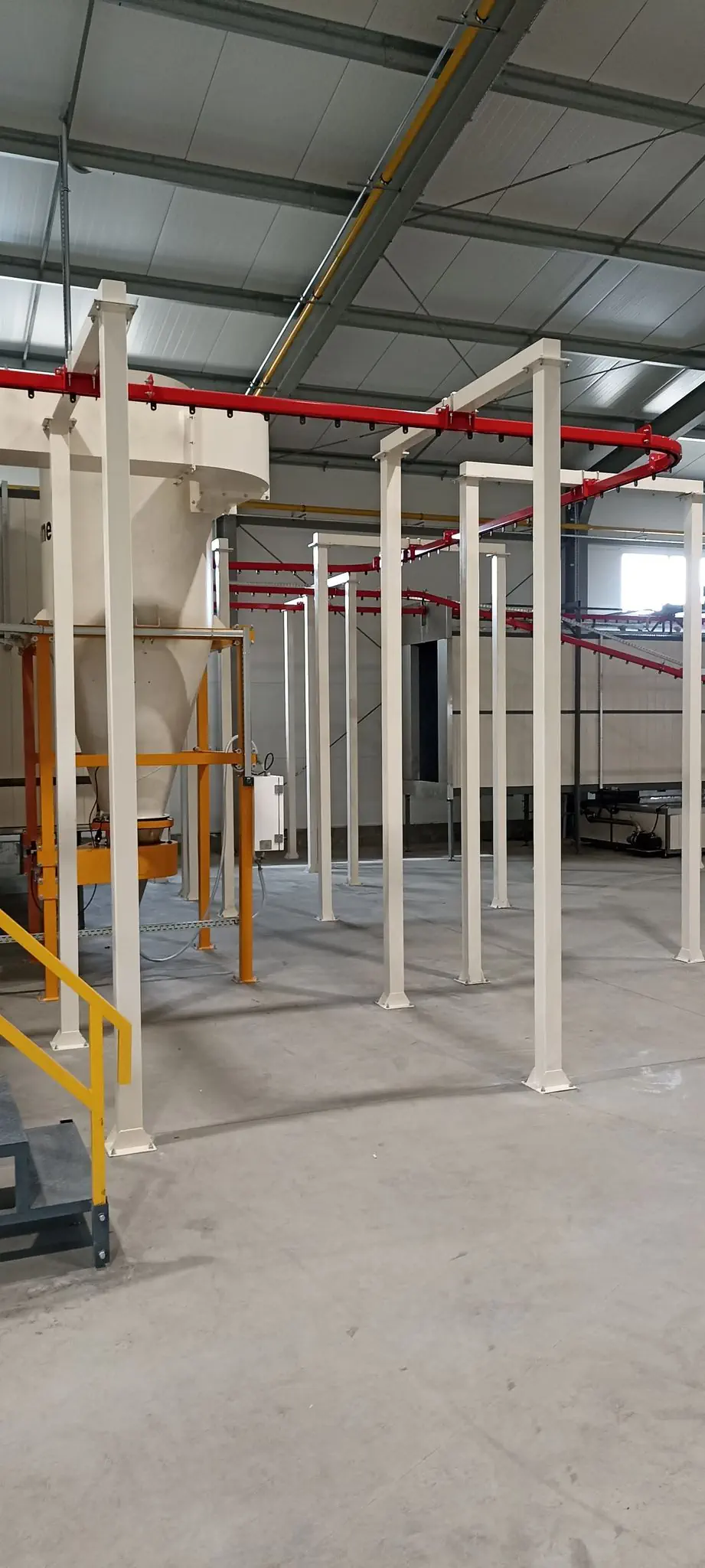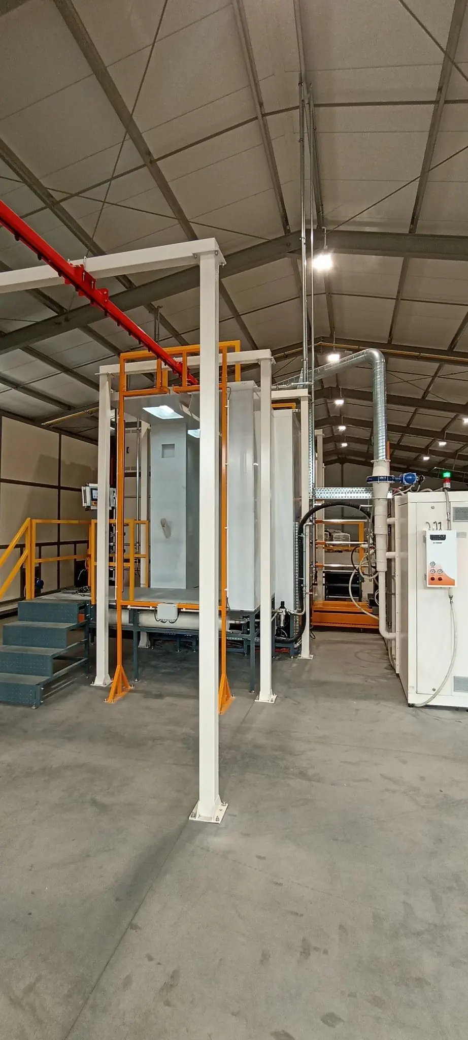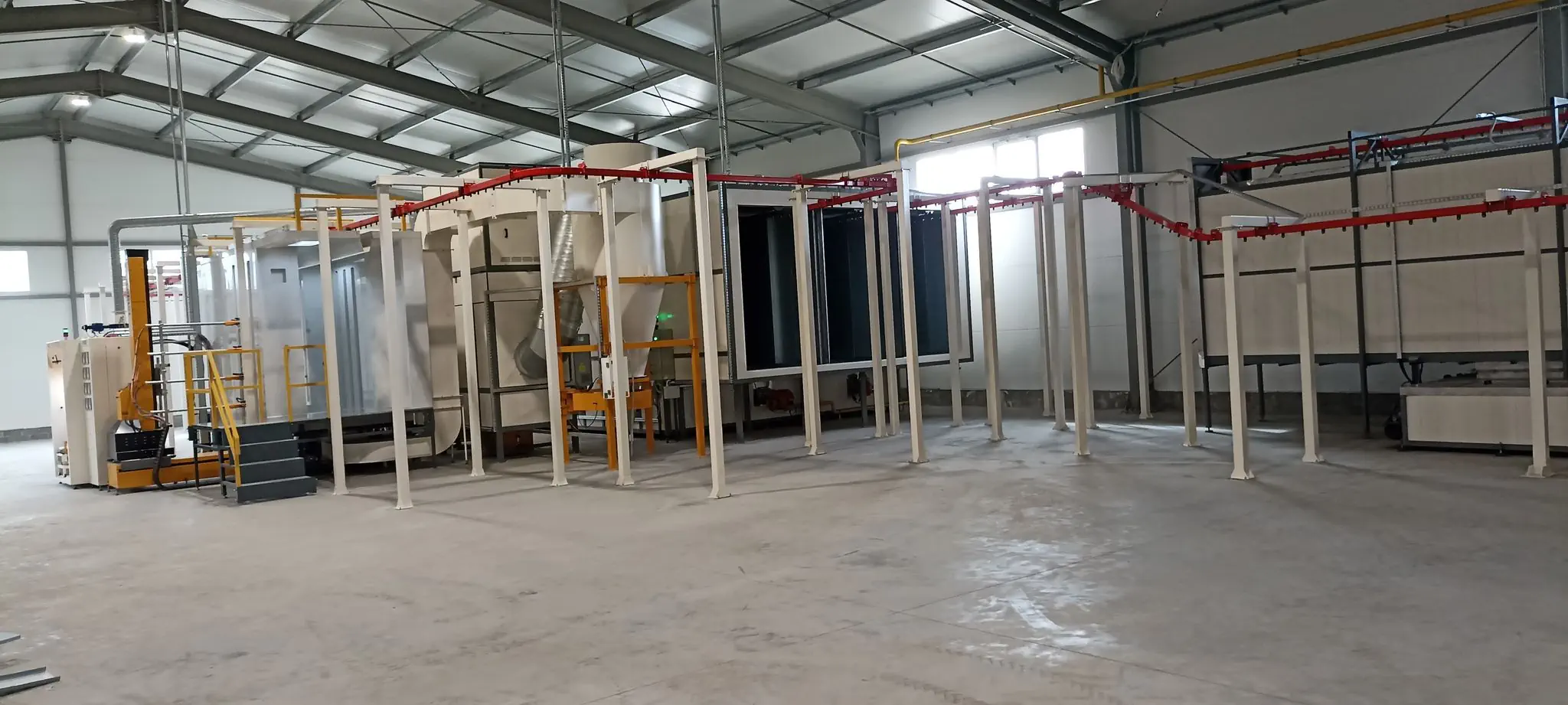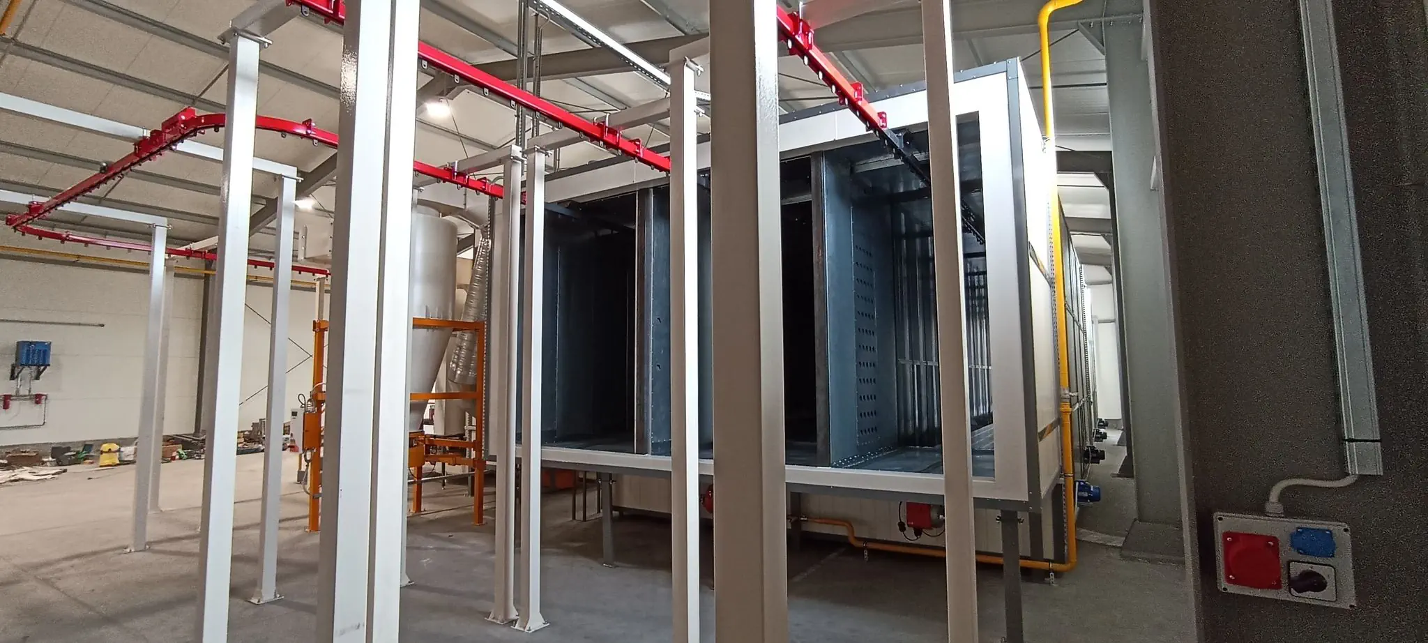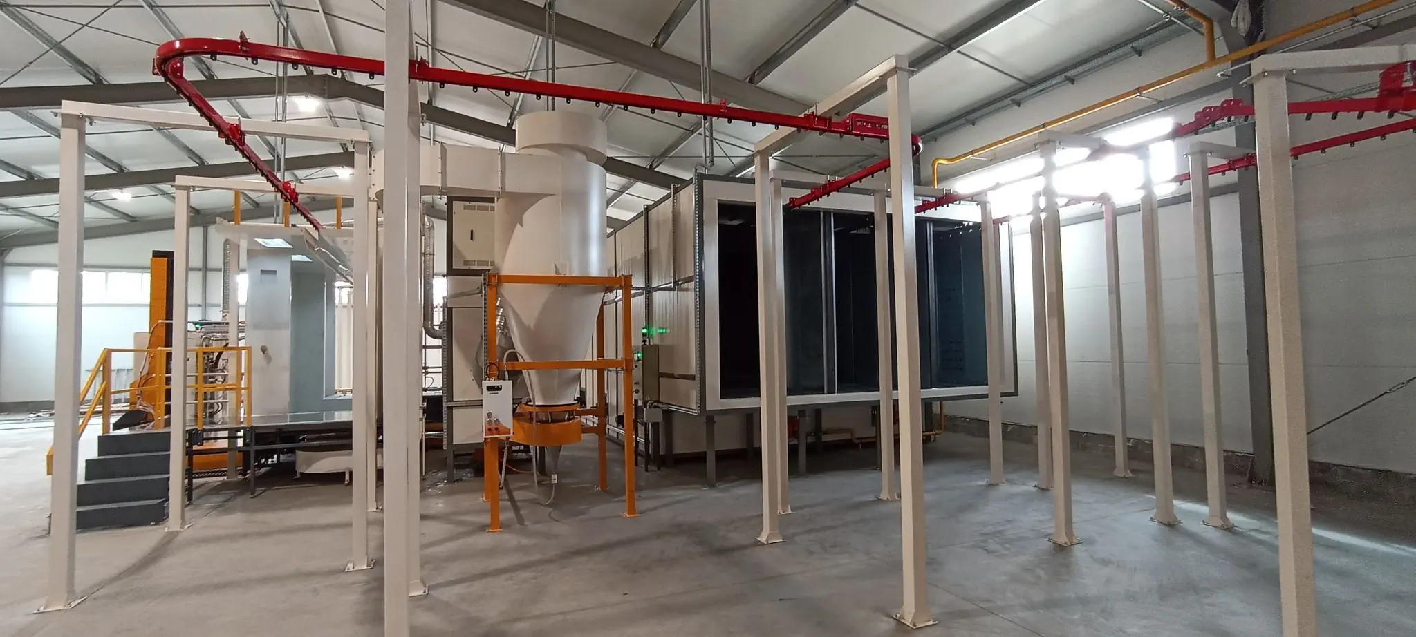 Malowanie realizowane jest w kompaktowej kabinie proszkowej z systemem odzysku farby i skuteczną filtracją. Kabina przystosowana jest do pracy z systemami zautomatyzowanymi lub ręcznymi i pozwala na szybkie przezbrojenie między kolorami. Dzięki szczelności, antystatycznym osłonom i niskiej emisji pyłów, strefa aplikacji spełnia wymagania BHP i środowiskowe.
