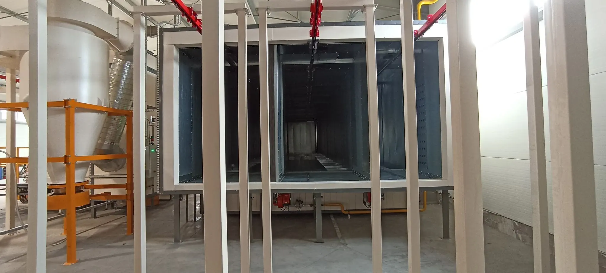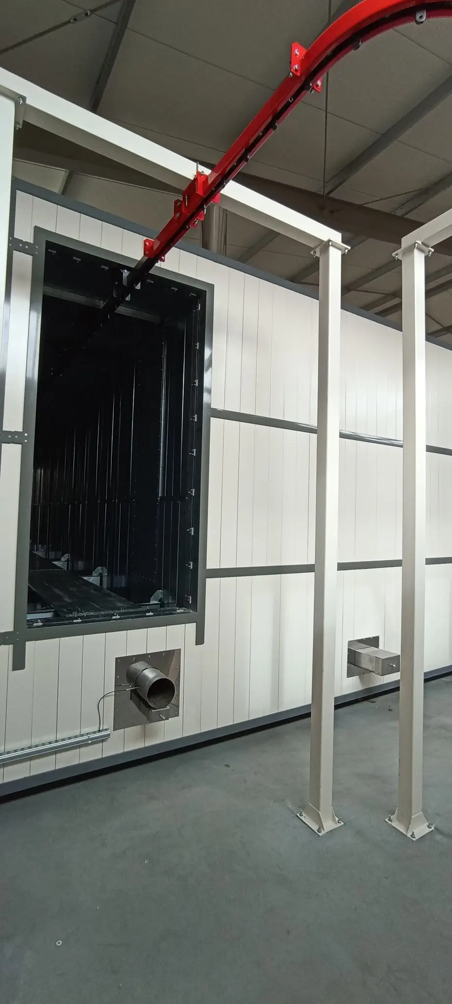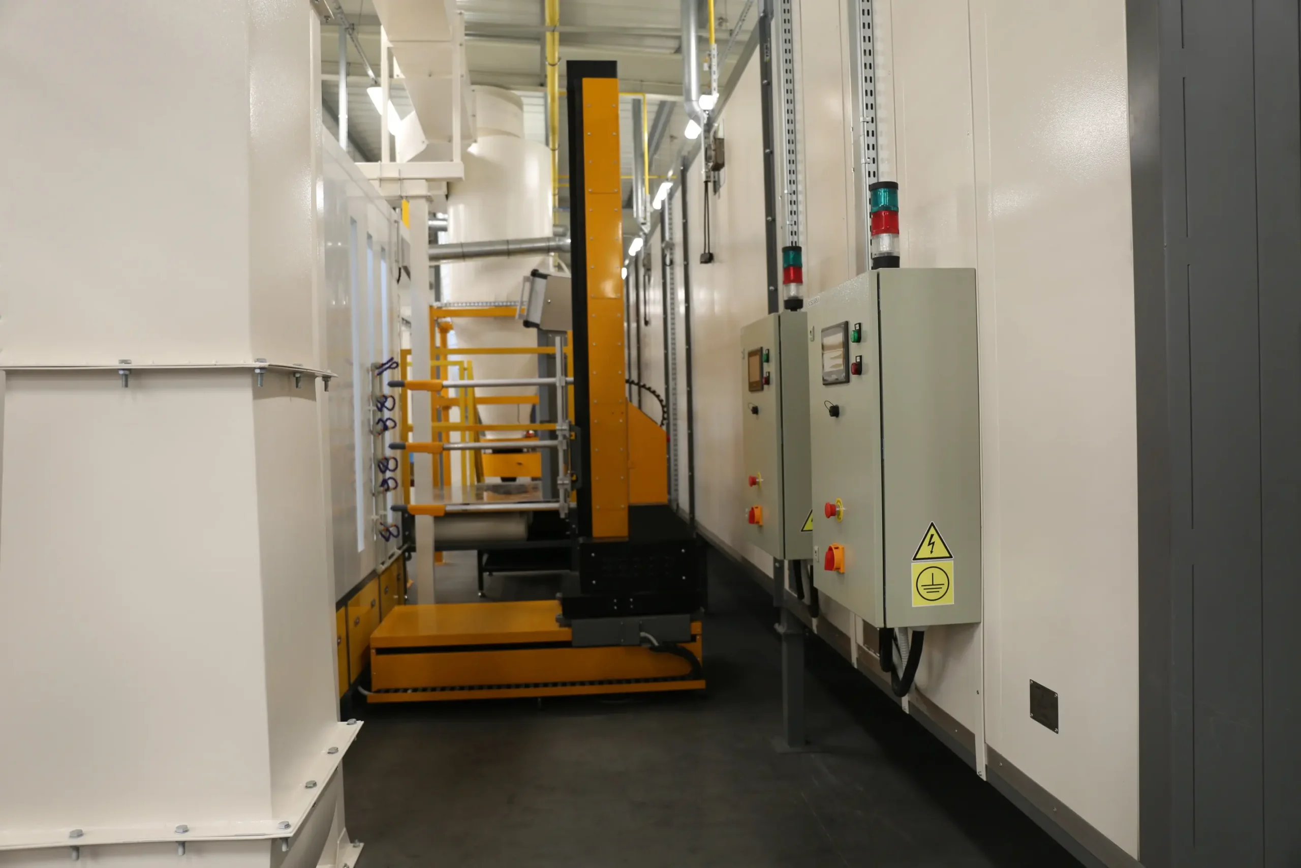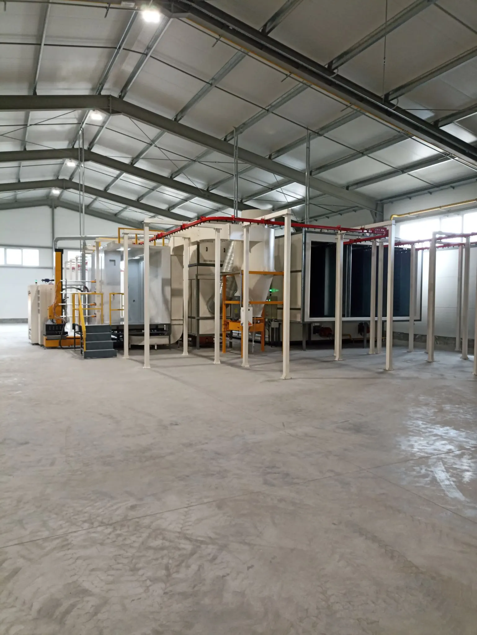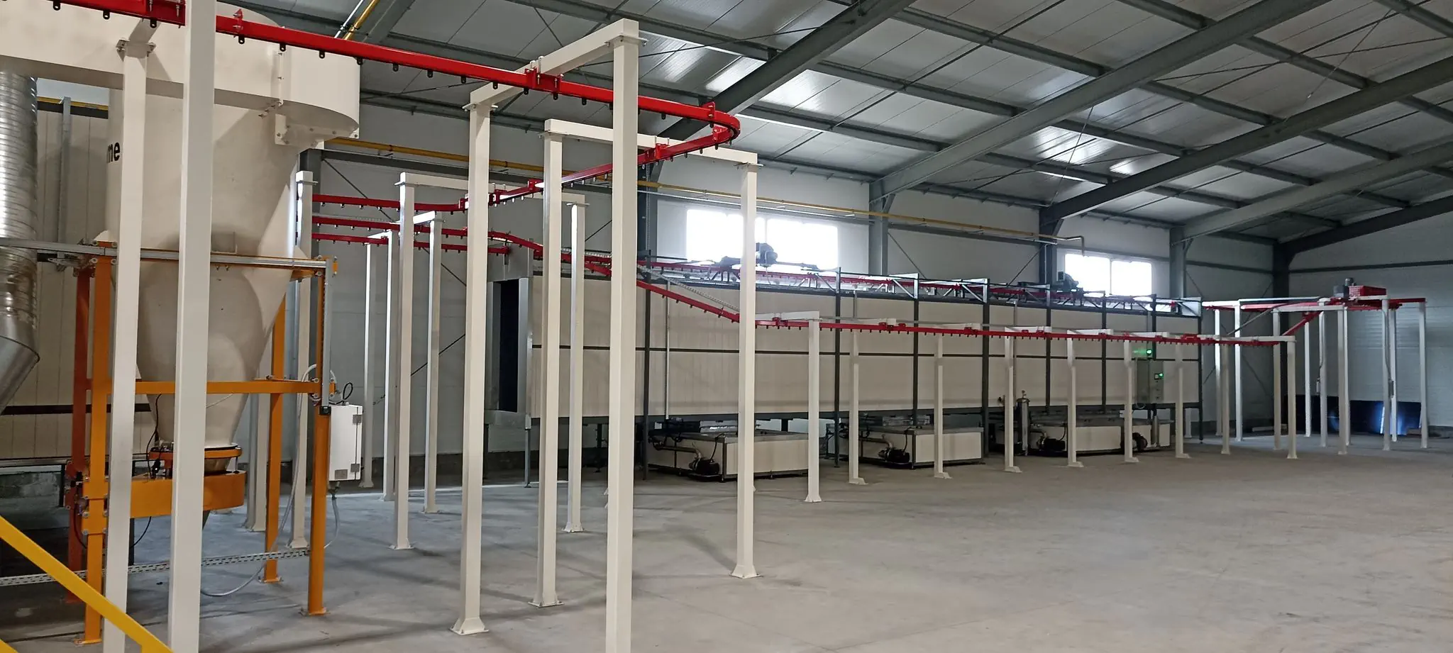 Malowanie realizowane jest w kompaktowej kabinie proszkowej z systemem odzysku farby i skuteczną filtracją. Kabina przystosowana jest do pracy z systemami zautomatyzowanymi lub ręcznymi i pozwala na szybkie przezbrojenie między kolorami. Dzięki szczelności, antystatycznym osłonom i niskiej emisji pyłów, strefa aplikacji spełnia wymagania BHP i środowiskowe.