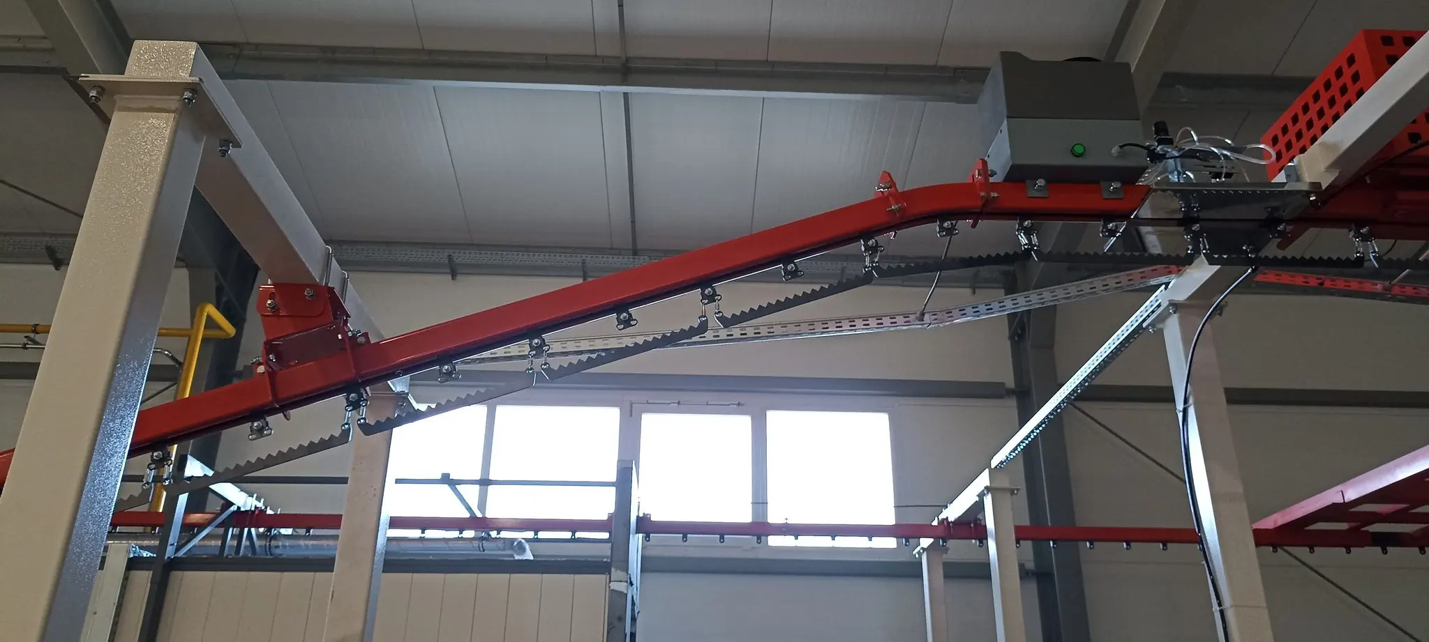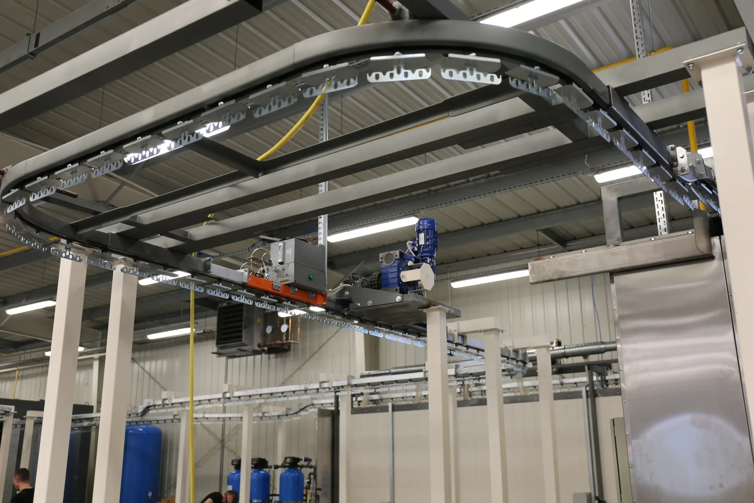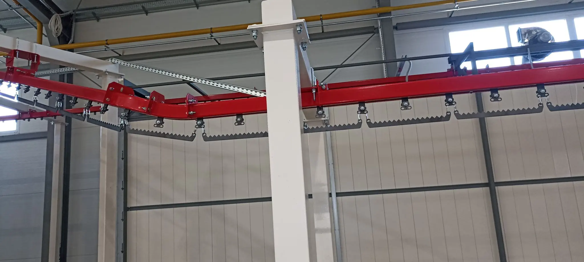 Całość linii połączona jest automatycznym przenośnikiem jednoszynowym o długości 120 m. Wyposażony w napęd typu Caterpillar, system fotooptycznych czujników, automatyczną smarownicę i falownik, zapewnia stabilny transport zawieszek przez wszystkie strefy technologiczne. Możliwość kontroli prędkości i łagodnego przyspieszania eliminuje kołysanie detali.