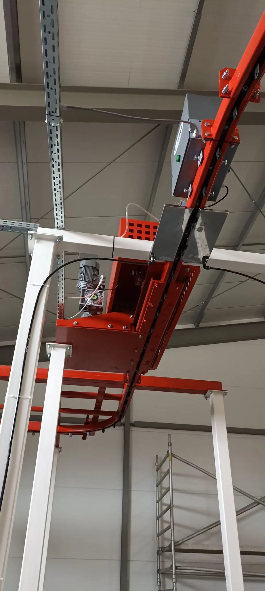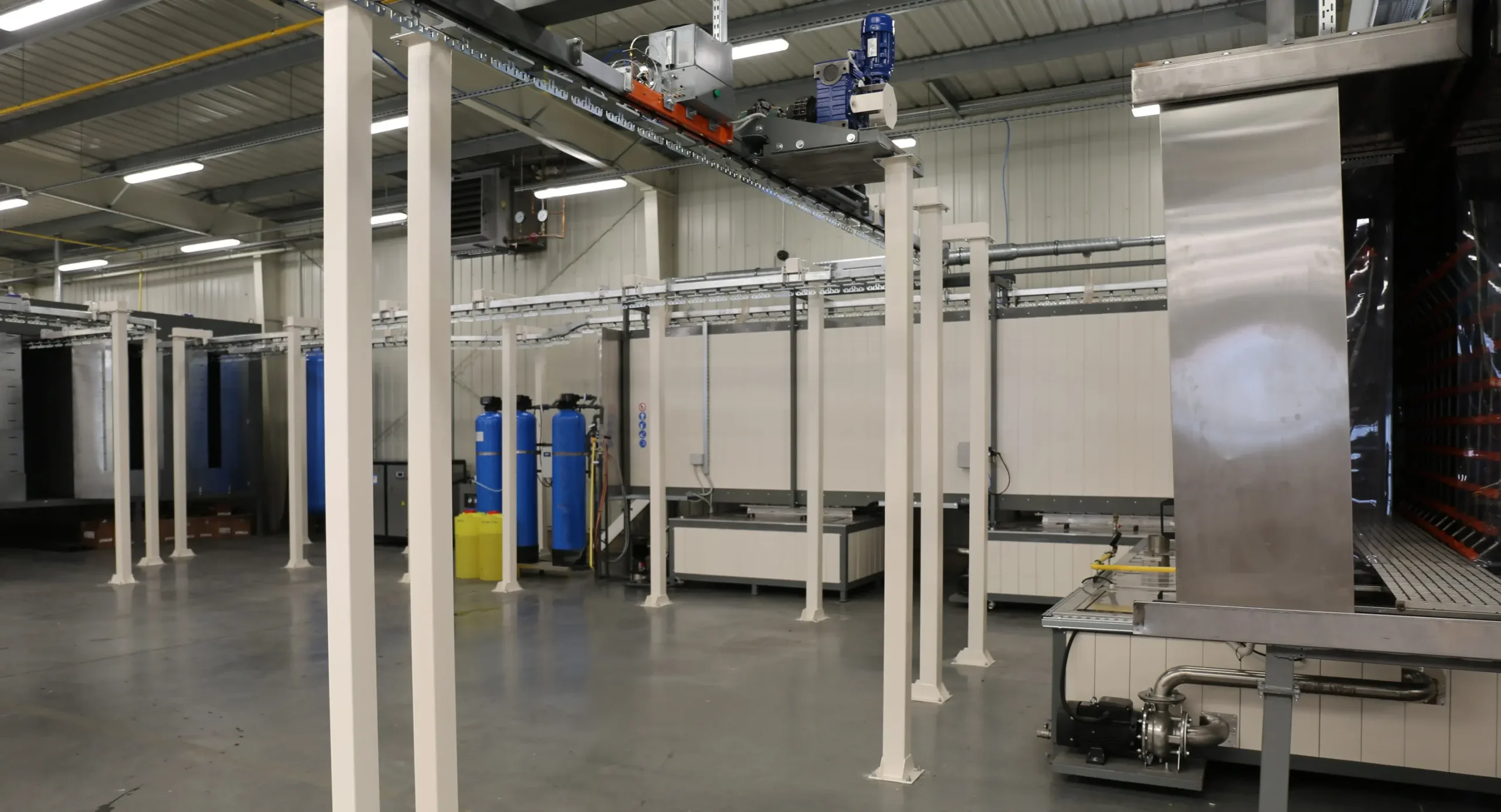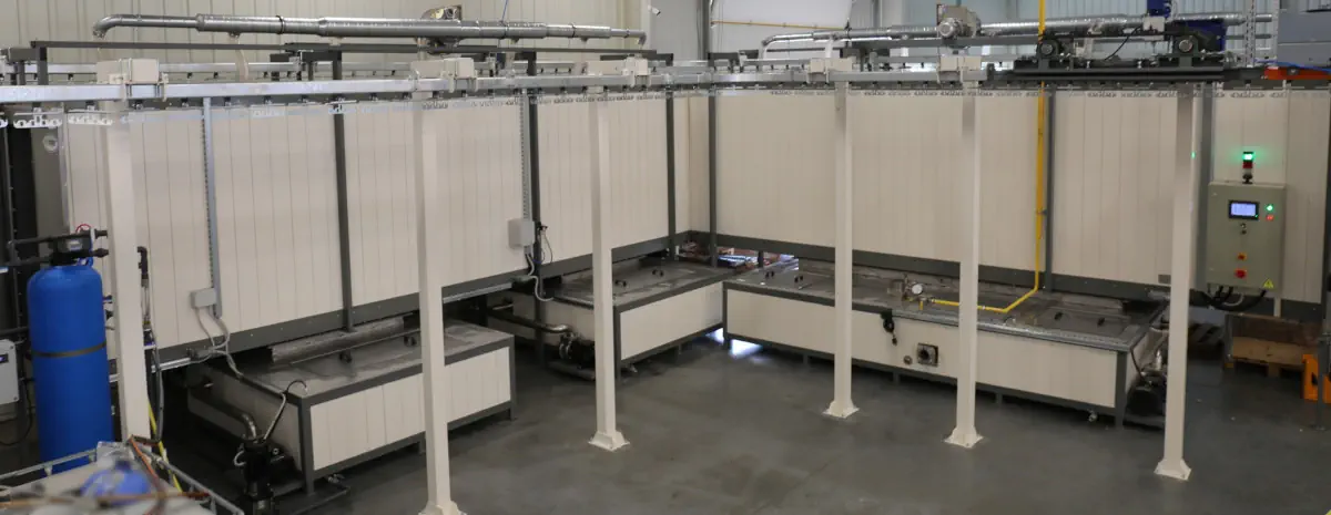 Całość linii połączona jest automatycznym przenośnikiem jednoszynowym o długości 120 m. Wyposażony w napęd typu Caterpillar, system fotooptycznych czujników, automatyczną smarownicę i falownik, zapewnia stabilny transport zawieszek przez wszystkie strefy technologiczne. Możliwość kontroli prędkości i łagodnego przyspieszania eliminuje kołysanie detali.