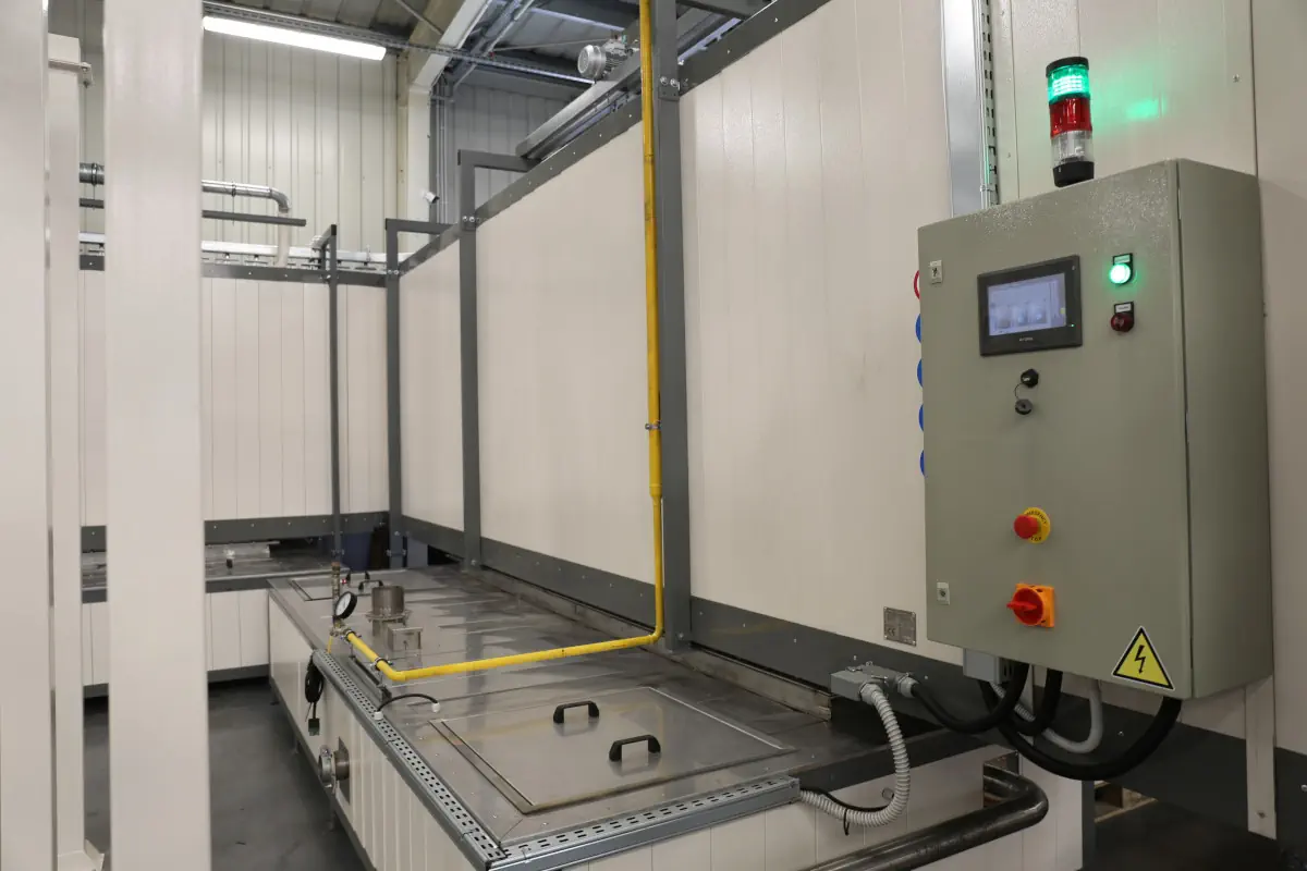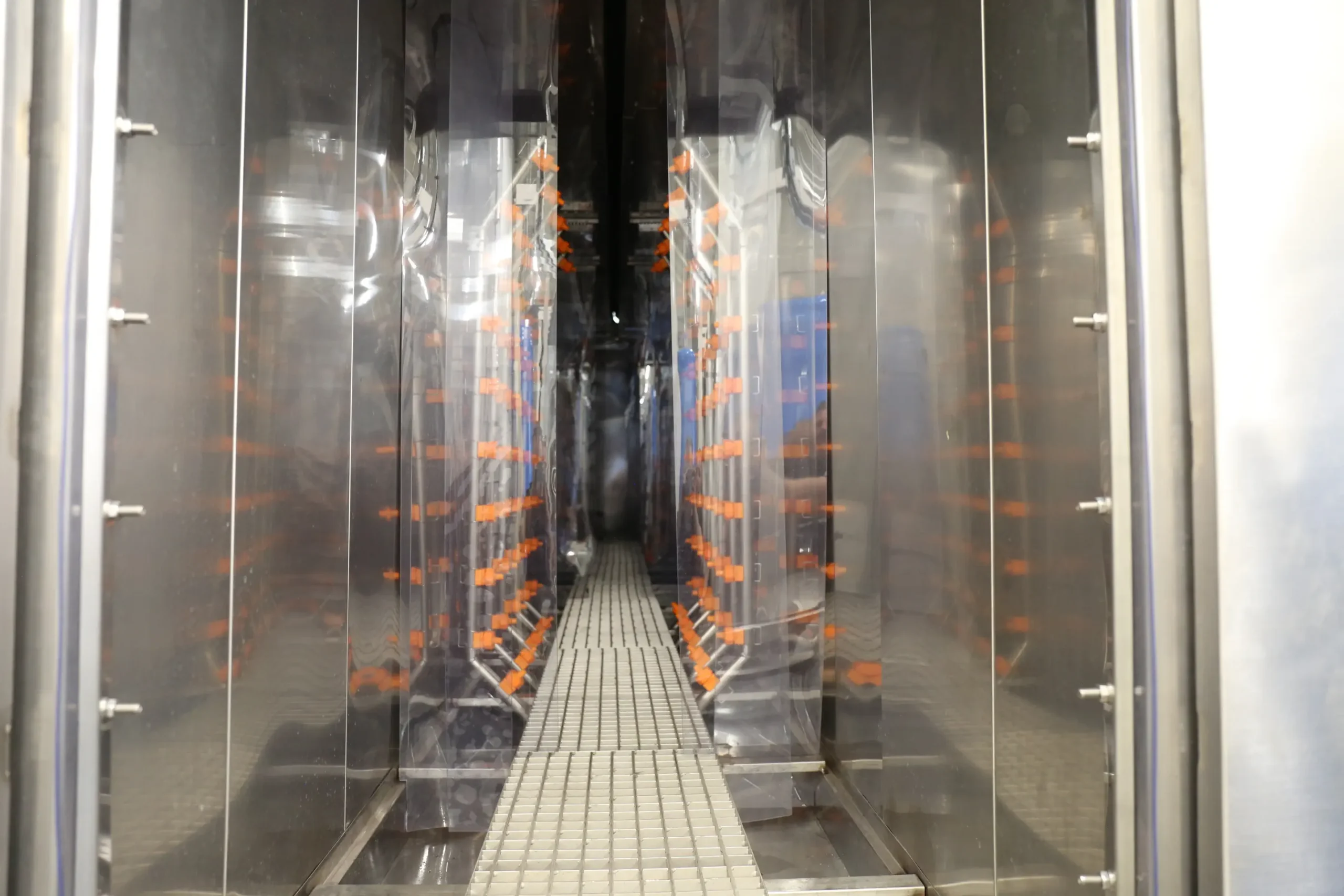 Proces rozpoczyna się w nowoczesnej myjni tunelowej wykonanej ze stali nierdzewnej, wyposażonej w trzy strefy natryskowe z izolowanymi zbiornikami. Układ pomp i system kaskadowego powrotu cieczy zapewniają wysoką efektywność mycia oraz redukcję zużycia wody i środków chemicznych. Operator ma dostęp do wnętrza myjni, a cały proces wspierają systemy filtracyjne i kondensacyjny wymiennik ciepła z palnikiem gazowym.