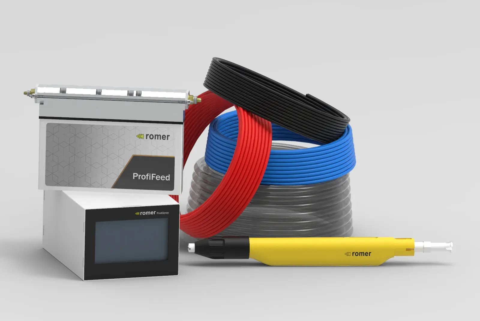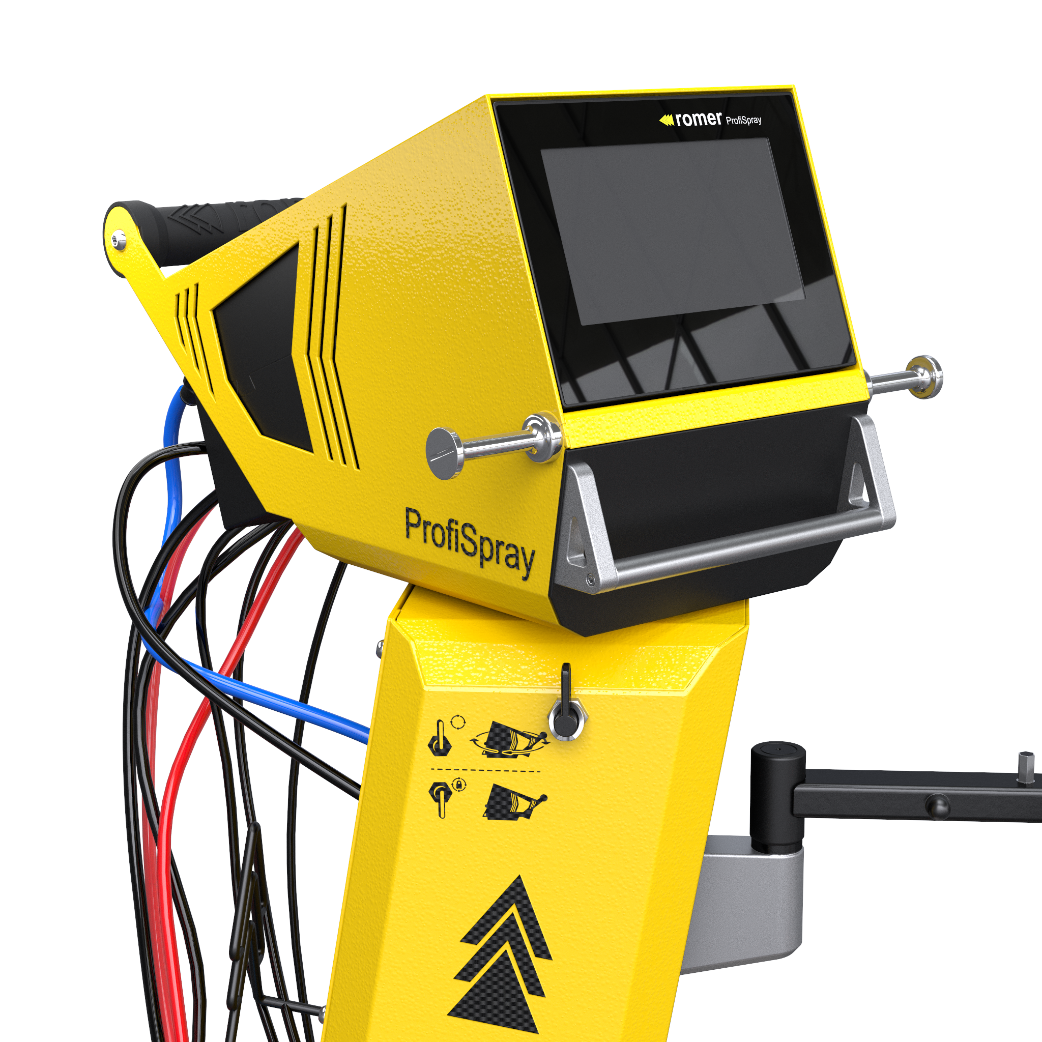 Nowy aplikator ROMER ProfiSpray V wyróżnia się intuicyjnym 7-calowym wyświetlaczem z systemem podpowiedzi, ułatwiającym pracę nawet niedoświadczonym użytkownikom, oraz praktycznymi rozwiązaniami jak uchwyt na pistolet, szuflada na akcesoria i szybka zmiana koloru z kartonu.