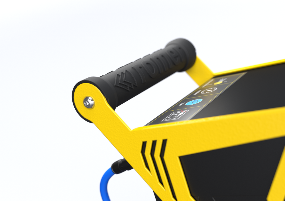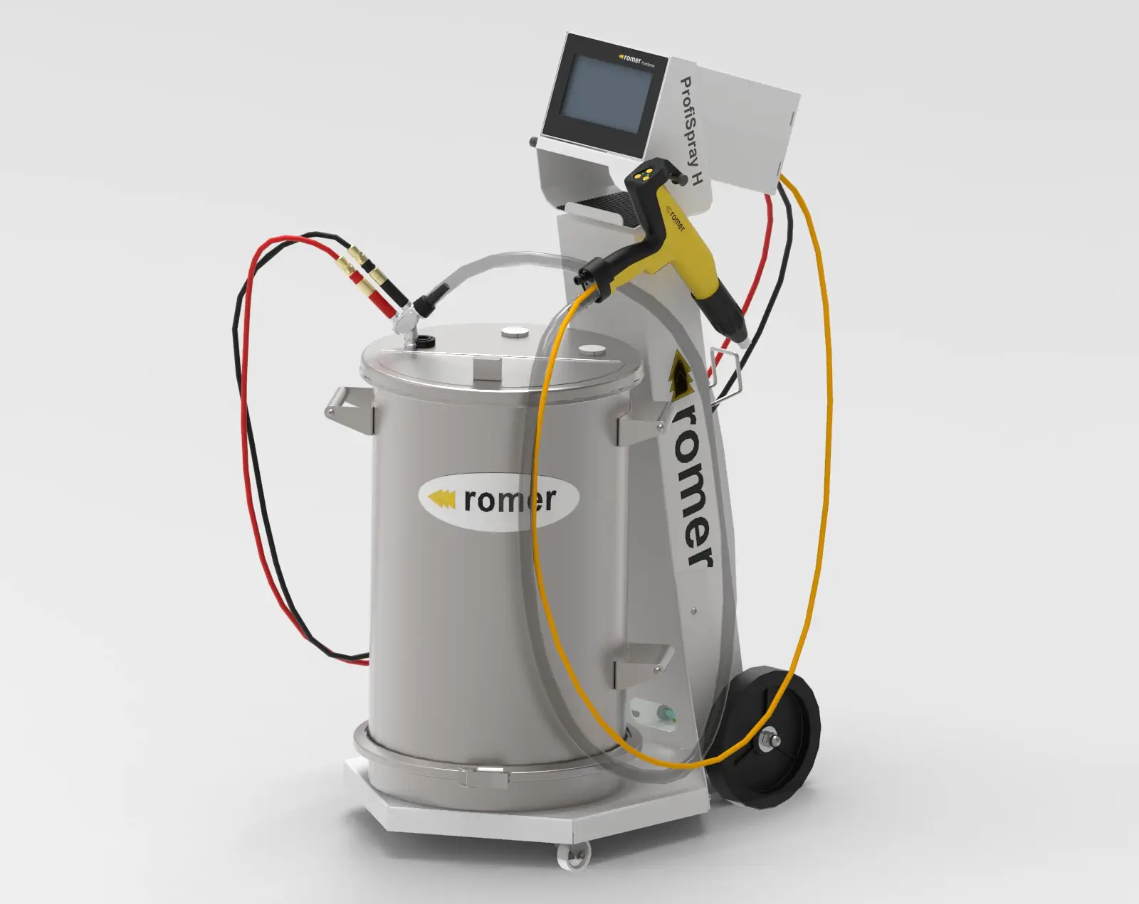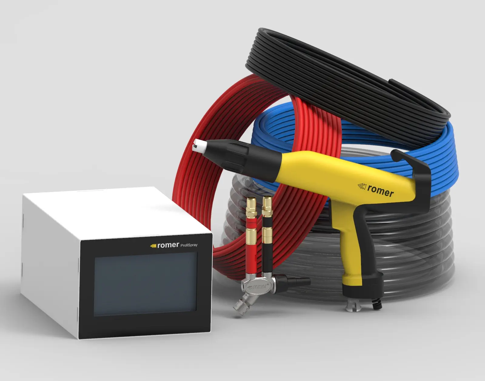 Pistolet ROMER to lekkie, ergonomiczne narzędzie o doskonałym wyważeniu i profilowanej, przewodzącej rączce, która zapewnia pewny chwyt i skuteczne uziemienie malarza. W rękojeści umieszczono intuicyjne sterowanie – regulację udziału farby oraz zmianę programów – bez potrzeby przerywania pracy. Ceramiczna kaskada o napięciu do 100 000 V (polaryzacja ujemna) skutecznie ładuje każdy rodzaj proszku, a nowa generacja dysz umożliwia precyzyjne pokrycie nawet najbardziej skomplikowanych kształtów. Pistolet wykonano z materiałów odpornych na uderzenia, a jego rozbieralna konstrukcja z wymienną rurką proszkową ułatwia konserwację. Model objęty jest patentem w UE i USA.