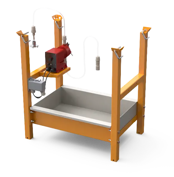 Urządzenie wyposażone jest w automatyczną pompę dozującą, elastyczne przewody z końcówkami zabezpieczającymi oraz wannę wychwytową zapobiegającą przypadkowym wyciekom.